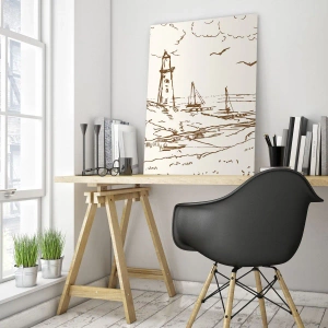 - Eine künstlerische Skizze zeigt einen Leuchtturm an der Küste mit schwimmenden Vögeln und Segelbooten auf dem Wasser. Die zarten Linien und die minimalistische Form verleihen der Komposition eine elegante und ruhige Atmosphäre. Eine perfekte Dekoration...