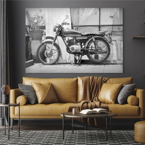 Glasbild - Bild auf glas - Ein Motorrad im Retro-Stil steht vor einer Holzwand - 50x70cm - Klassik über alles - Moderne Wanddekoration für Wohnzimmer und Schlafzimmer ARTTOR