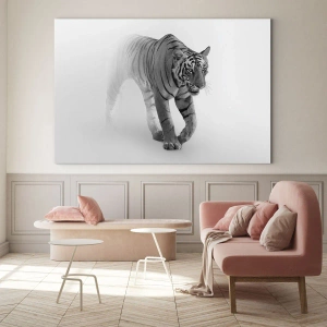 Glasbild - Bild auf glas - Ein Tiger schreitet durch den Nebel, mit subtiler Unschärfe im Hintergrund - 70x50cm - Im Nebel gelauert - Moderne Wanddekoration für Wohnzimmer und Schlafzimmer ARTTOR