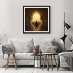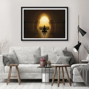 Poster in einem schwarzem Rahmen - Silhouette einer meditierenden Person im Licht der untergehenden Sonne - 70x50cm - Vollkommene Harmonie - Moderne Wanddekoration für Wohnzimmer und Schlafzimmer ARTTOR