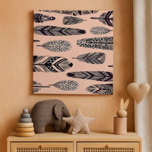 Das Leinwandbild „Dekorative Federn auf hellem Hintergrund“ ist eine dezente und elegante Wanddekoration, die mit ihrem einzigartigen Muster die Aufmerksamkeit auf sich zieht. Es zeigt schwarze und weiße Federn, die auf einem pastellrosa Hintergrund angeordnet sind und eine harmonische und stilvolle Komposition bilden. Jede Feder besticht durch ihr einzigartiges, geometrisches Muster, das dem Bild künstlerischen Charakter und Einzigartigkeit verleiht.