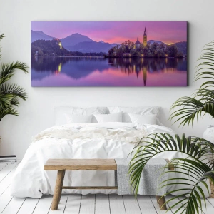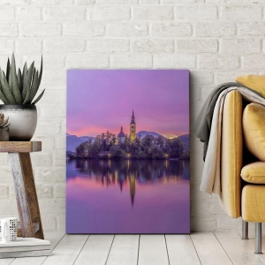 Bild auf Leinwand - Leinwandbild - See mit einer Insel und einer Kirche bei Sonnenuntergang - 80x120cm - Eine märchenhafte Insel in der Abenddämmerung - Moderne Wanddekoration für Wohnzimmer und Schlafzimmer ARTTOR
