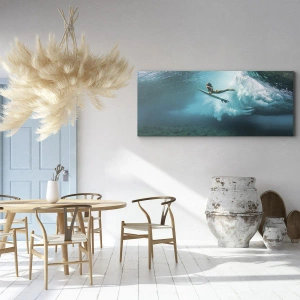 Bild auf Leinwand - Leinwandbild - Surfer unter einer Welle im blauen Ozeanwasser - 80x120cm - Unterwasserwelt - Moderne Wanddekoration für Wohnzimmer und Schlafzimmer ARTTOR