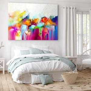 Das Motiv der abstrakten, bunten Blumen ist eine Dekoration, die nicht nur Schönheit in den Innenraum bringt, sondern auch positive Energie und Inspiration. Dies ist ein Vorschlag für alle, die originelle und einzigartige Einrichtungselemente suchen.
