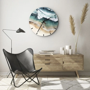 Wanduhr „Ewiges Treffen“ ist ein einzigartiges Projekt, das das Phänomen des Zusammentreffens von Wellen und Strand darstellt. Die Vogelperspektive fängt den Moment ein, in dem das Meer an den Sandstrand bricht und einen hypnotisierenden Rhythmus der Natur erzeugt.