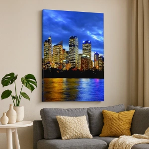 Der Anblick der beleuchteten Gebäude symbolisiert Dynamik, Energie und einen modernen Lebensstil. Die unterschiedlichen Höhen der Wolkenkratzer und die farbenfrohen Reflexionen im Wasser verleihen Tiefe und ziehen den Blick auf sich. Das Gemälde eignet sich perfekt für ein Wohnzimmer, Büro oder Arbeitszimmer und unterstreicht die Eleganz und den Stil des Interieurs.