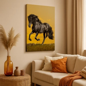 - Ein Gemälde auf Leinwand, das ein galoppierendes schwarzes Pferd vor dem Hintergrund eines goldenen Sonnenuntergangs zeigt.
