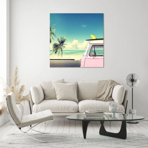 Dieses aus Glas höchster Qualität gefertigte Gemälde fängt die Details einer tropischen Landschaft ein, wie die Texturen der Palmen, die Schattierungen des blauen Himmels und Meeres und die Details eines klassischen Vans. Die Glasoberfläche betont die Farbtiefe und verleiht der gesamten Komposition Eleganz.