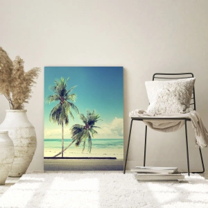 Das tropische Motiv mit Palmen und einer Küstenlandschaft bringt eine warme und exotische Atmosphäre ins Interieur, perfekt für alle, die sommerliche Inspiration schätzen. Dieser Druck passt perfekt in ein Wohnzimmer, Schlafzimmer oder einen Loungebereich und verleiht ihm einen Hauch von Sommerfrische.