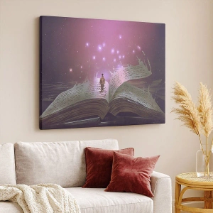 Bild auf Leinwand - Leinwandbild - Eine Figur tritt in einem magischen Licht auf ein offenes Buch. - 160x50cm - Einladung in eine andere Welt - lesen Sie! - Moderne Wanddekoration für Wohnzimmer und Schlafzimmer ARTTOR