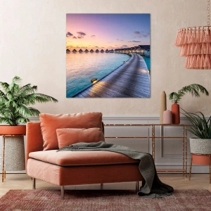 Leinwandkunstdruck „Urlaub – Rückkehr zu den Quellen“ ist ein einzigartiges Dekorationselement, das Sie in eine tropische Atmosphäre voller Ruhe und Luxus entführt. Es zeigt einen malerischen Pier, der zu den Wasserhäusern führt, gebadet im warmen Licht der untergehenden Sonne.