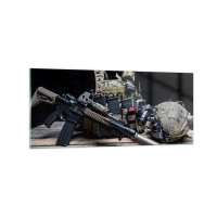 Glasbild - Bild auf glas - Taktische Ausrüstung mit einem Gewehr auf einem Holztisch - 120x50cm - Sich ausruhen! - Moderne Wanddekoration für Wohnzimmer und Schlafzimmer ARTTOR