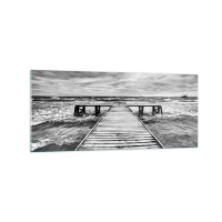 Glasbild - Bild auf glas - Eine Schwarz-Weiß-Ansicht eines Holzstegs über einer stürmischen See. - 120x50cm - Ich warte darauf, dass der Wind wegjagt... - Moderne Wanddekoration für Wohnzimmer und Schlafzimmer ARTTOR
