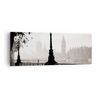 Bild auf Leinwand - Leinwandbild - Eine monochrome Ansicht von Big Ben und der Themse. - 140x50cm - Londoner Morgen - Moderne Wanddekoration für Wohnzimmer und Schlafzimmer ARTTOR