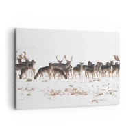 Bild auf Leinwand - Leinwandbild - Eine Herde Hirsche vor einem verschneiten Hintergrund - 100x70cm - Kommen die Weihnachten? - Moderne Wanddekoration für Wohnzimmer und Schlafzimmer ARTTOR