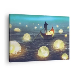 Bild auf Leinwand - Leinwandbild - Eine Figur in einem Boot, umgeben von leuchtenden Kugeln auf dem Wasser - 70x50cm - Dinge, von denen Philosophen nie geträumt haben - Moderne Wanddekoration für Wohnzimmer und Schlafzimmer ARTTOR