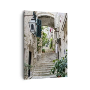 Bild auf Leinwand - Leinwandbild - Küstenlandschaft mit Booten und bunten Häusern - 50x70cm - Romantische Oase - Moderne Wanddekoration für Wohnzimmer und Schlafzimmer ARTTOR