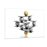 Glasbild - Bild auf glas - Geometrische Komposition mit Kugeln und Plattformen auf weißem Hintergrund - 120x80cm - Gold- und Silberbalance - Moderne Wanddekoration für Wohnzimmer und Schlafzimmer ARTTOR