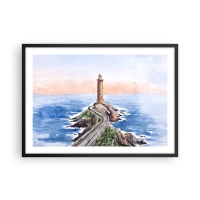 Poster in einem schwarzem Rahmen - Ein Leuchtturm an einer felsigen Küste - 70x50cm - Dem Meer zugewandt - Moderne Wanddekoration für Wohnzimmer und Schlafzimmer ARTTOR