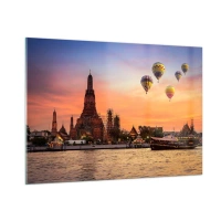 Glasbild - Bild auf glas - Tempel am Fluss bei Sonnenuntergang mit Ballons - 100x70cm - Hier werden Märchen geboren - Moderne Wanddekoration für Wohnzimmer und Schlafzimmer ARTTOR