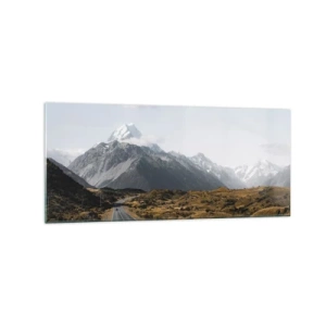 Glasbild - Bild auf glas - Eine Straße in den Bergen, umgeben von einer malerischen Landschaft - 120x50cm - Der Weg ins Herz der Berge - Moderne Wanddekoration für Wohnzimmer und Schlafzimmer ARTTOR