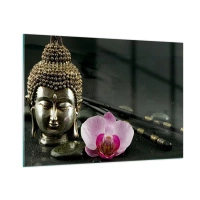 Glasbild - Bild auf glas - Buddhistischer Kopf mit einer rosa Blume auf einem Hintergrund aus Steinen - 100x70cm - Harmonie von Weisheit und Schönheit - Moderne Wanddekoration für Wohnzimmer und Schlafzimmer ARTTOR