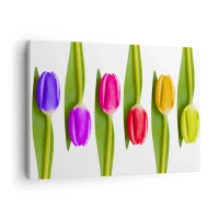Bild auf Leinwand - Leinwandbild - Bunte Tulpen in einer Reihe auf weißem Hintergrund angeordnet - 70x50cm - Regenbogenkomposition - Moderne Wanddekoration für Wohnzimmer und Schlafzimmer ARTTOR