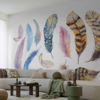 Maßgeschneiderte Fototapete Premium Sand - Hell, bunt und bunt - Vogelfedern, Vögel, Grafik