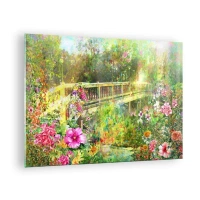 Glasbild - Bild auf glas - Eine Brücke umgeben von üppiger Vegetation und bunten Blumen - 70x50cm - Eine Brücke aus Frühlingsseufzern - Moderne Wanddekoration für Wohnzimmer und Schlafzimmer ARTTOR