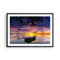 Poster in einem schwarzem Rahmen - Ein Boot auf ruhigem Wasser bei Sonnenuntergang - 70x50cm - Du scheinst mitten am Himmel zu hängen... - Moderne Wanddekoration für Wohnzimmer und Schlafzimmer ARTTOR