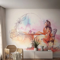 Fototapete Standard Eco - Eine romantische Frau an einem Tisch mit Blick auf den Turm - 100x70cm - Pariser Chic - Moderne Wanddekoration für Wohnzimmer und Schlafzimmer ARTTOR