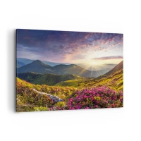 Bild auf Leinwand - Leinwandbild - Berglandschaft mit blühenden Rhododendren - 100x70cm - Frische am Bergmorgen - Moderne Wanddekoration für Wohnzimmer und Schlafzimmer ARTTOR