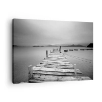 Bild auf Leinwand - Leinwandbild - Eine Schwarz-Weiß-Ansicht eines Holzstegs und eines ruhigen Sees. - 120x80cm - Hinter den Bergen, jenseits der Meere - Moderne Wanddekoration für Wohnzimmer und Schlafzimmer ARTTOR