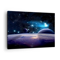 Bild auf Leinwand - Leinwandbild - Ein Blick in den Weltraum mit Planeten und Sternen - 70x50cm - Noch allein? - Moderne Wanddekoration für Wohnzimmer und Schlafzimmer ARTTOR