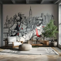 Fototapete Standard Eco - Zeichnungen von Jazzmusikern vor dem Hintergrund einer Stadtlandschaft - 100x70cm - New Yorker Improvisation - Moderne Wanddekoration für Wohnzimmer und Schlafzimmer ARTTOR