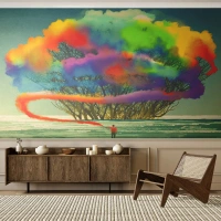 Fototapete Standard Eco - Ein Baum, umgeben von farbigem Rauch und eine Figur mit einer Fackel - 100x70cm - Erwecke diese Welt zum Leben - Moderne Wanddekoration für Wohnzimmer und Schlafzimmer ARTTOR