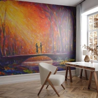 Fototapete Premium Canvas - Romantisches Paar auf einer Brücke im herbstlichen Wald - 100x70cm - Der Himmel liebt sie auch - Moderne Wanddekoration für Wohnzimmer und Schlafzimmer ARTTOR