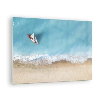 Glasbild - Bild auf glas - Ein Segelboot auf dem azurblauen Meer an einem Sandstrand - 70x50cm - An der Grenze von Blau und Gold - Moderne Wanddekoration für Wohnzimmer und Schlafzimmer ARTTOR