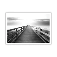 Poster - Ein Schwarzweißbild eines Holzstegs, der zum Horizont führt. - 100x70cm - In die Ferne ... - Moderne Wanddekoration für Wohnzimmer und Schlafzimmer ARTTOR