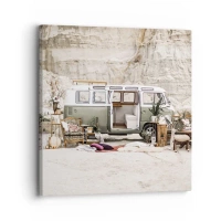 Bild auf Leinwand - Leinwandbild - Ein Retro-Camper im Boho-Design vor einer felsigen Landschaft. - 70x50cm - Es ist die Zeit, die Reise zu beginnen - Moderne Wanddekoration für Wohnzimmer und Schlafzimmer ARTTOR