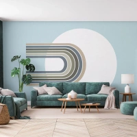Fototapete Standard Eco - Geometrische Komposition mit Bögen und einem Kreis auf blauem Hintergrund - 100x70cm - Unwiderstehliche Anziehungskraft - Moderne Wanddekoration für Wohnzimmer und Schlafzimmer ARTTOR
