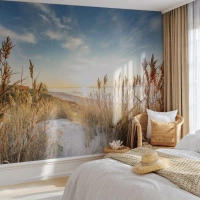 Fototapete Premium Canvas - Ein malerischer Strand mit Gras und untergehender Sonne - 100x70cm - Nordstrand - Moderne Wanddekoration für Wohnzimmer und Schlafzimmer ARTTOR