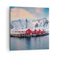 Bild auf Leinwand - Leinwandbild - Rote Häuser vor dem Hintergrund schneebedeckter Berge und des blauen Meeres - 70x100cm - Nördlicher Rückzug - Moderne Wanddekoration für Wohnzimmer und Schlafzimmer ARTTOR