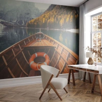 Fototapete Standard Eco - Blick von einem Holzboot auf einen von Bergen und Wäldern umgebenen See - 100x70cm - Bergreise - Moderne Wanddekoration für Wohnzimmer und Schlafzimmer ARTTOR