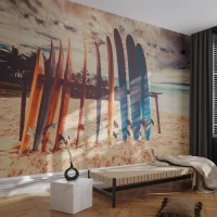 Fototapete Standard Eco - Bunte Surfbretter aufgereiht an einem Sandstrand - 100x70cm - Gute Nacht bis morgen - Moderne Wanddekoration für Wohnzimmer und Schlafzimmer ARTTOR