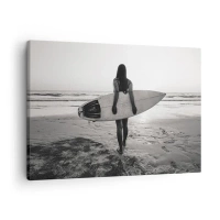 Bild auf Leinwand - Leinwandbild - Frau mit Surfbrett am Strand in Schwarz und Weiß - 50x70cm - Die Tochter der Meereswelle - Moderne Wanddekoration für Wohnzimmer und Schlafzimmer ARTTOR