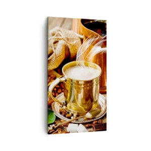 Bild auf Leinwand - Leinwandbild - Eine goldene Tasse Kaffee, umgeben von Bohnen, Krügen und Croissants - 160x50cm - Schönen Tag noch! - Moderne Wanddekoration für Wohnzimmer und Schlafzimmer ARTTOR