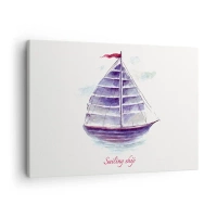 Bild auf Leinwand - Leinwandbild - Ein Aquarell eines Segelboots auf dem Wasser mit einer zarten Inschrift - 70x50cm - Volle Segel und ruhiges Wasser - Moderne Wanddekoration für Wohnzimmer und Schlafzimmer ARTTOR