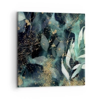Bild auf Leinwand - Leinwandbild - Elegante Blätter auf dunklem Hintergrund mit goldenen Akzenten - 100x70cm - Zaubergarten - Moderne Wanddekoration für Wohnzimmer und Schlafzimmer ARTTOR
