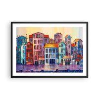 Poster in einem schwarzem Rahmen - Bunte Mietshäuser am Wasser im künstlerischen Stil - 70x50cm - Stadt wie aus einem Märchen - Moderne Wanddekoration für Wohnzimmer und Schlafzimmer ARTTOR